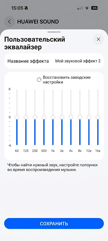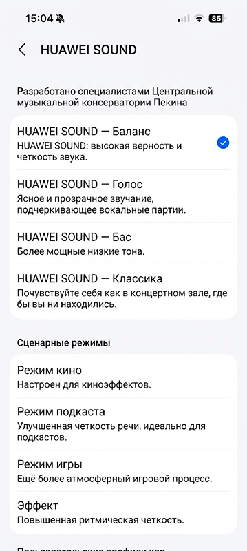 В приложении можно выбрать пресеты Huawei Sound (Balanced, Voice, Classical, Bass), разработанные вместе с экспертами Центральной консерватории музыки, или самостоятельно покрутить 10-полосный эквалайзер.
