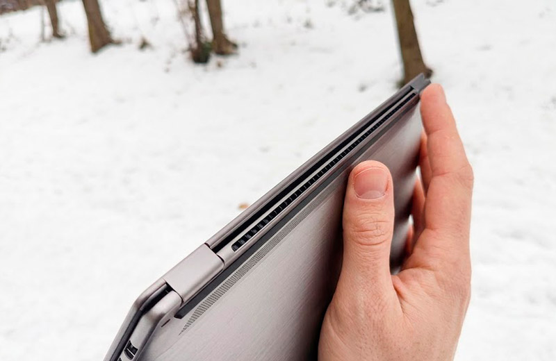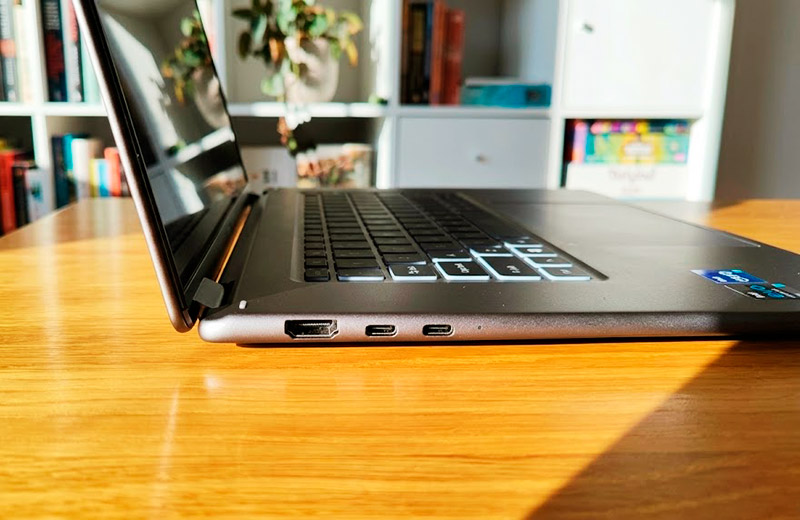 Ещё недавно бизнес-лэптопы грешили дефицитом портов. Наш герой этого недостатка лишён, хотя до эталона всё же недотянул. На левом торце разместились пара Thunderbolt 4 (USB-C), один из которых заберёт под себя зарядка и видеовыход HDMI 2.1.