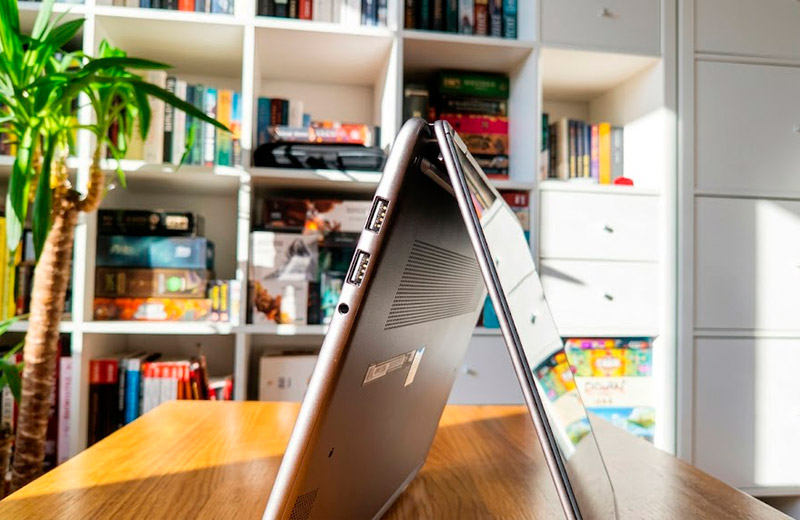 Шарнир крышки работает безукоризненно. Ход плавный, экран мёртвой хваткой фиксируется под любым углом. Конструкция позволяет откинуть дисплей на все 360 градусов, превратив лэптоп в массивный планшет.
