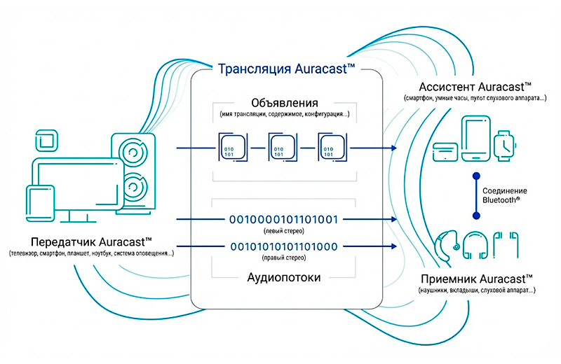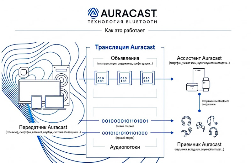 Разработка группы Bluetooth Special Interest Group (SIG) в корне меняет привычную архитектуру передачи звуковых данных. В отличие от классического Bluetooth, работающего по принципу «один к одному», Auracast транслирует аудиопоток неограниченному числу приёмников.