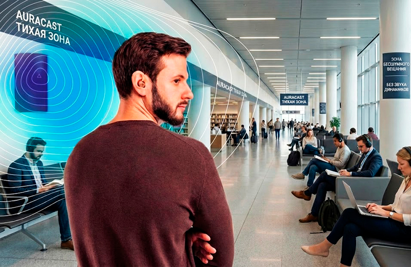 Представьте аэропорт или зал ожидания вокзала с десятками телевизоров. Раньше они либо кричали на весь зал, либо работали без звука. С Auracast вы подходите к экрану с расписанием или новостями, видите QR-код, сканируете — и звук идёт прямо в ваши наушники. Это трансляция звука на несколько наушников в масштабе города.