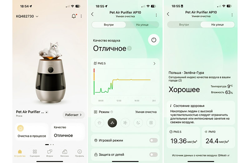Подключились по Wi-Fi и Bluetooth — и можно управлять климатом хоть с другого конца планеты. Связь не отваливается, всё работает предельно стабильно. На экране смартфона сразу видно, насколько чистый воздух в квартире.