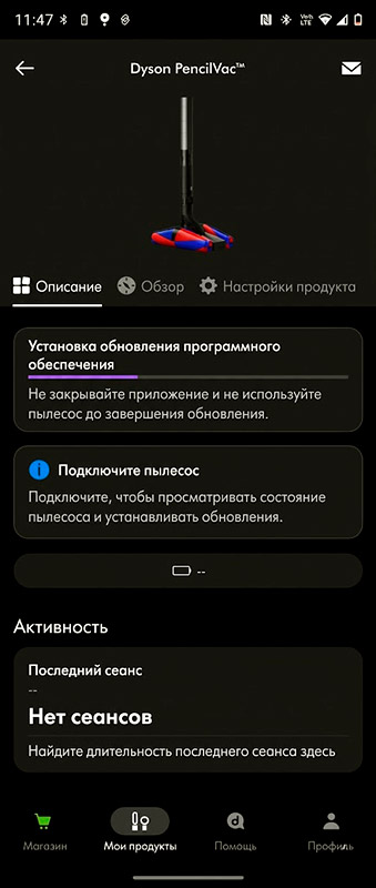 Перед стартом тестов я отправил пылесос на базу заряжаться и заодно установил приложение MyDyson. ПО пока работает скорее как маркетинговая витрина экосистемы бренда, но в ней можно найти полезные инструкции по уходу.