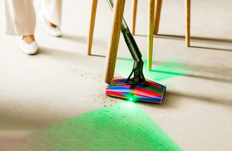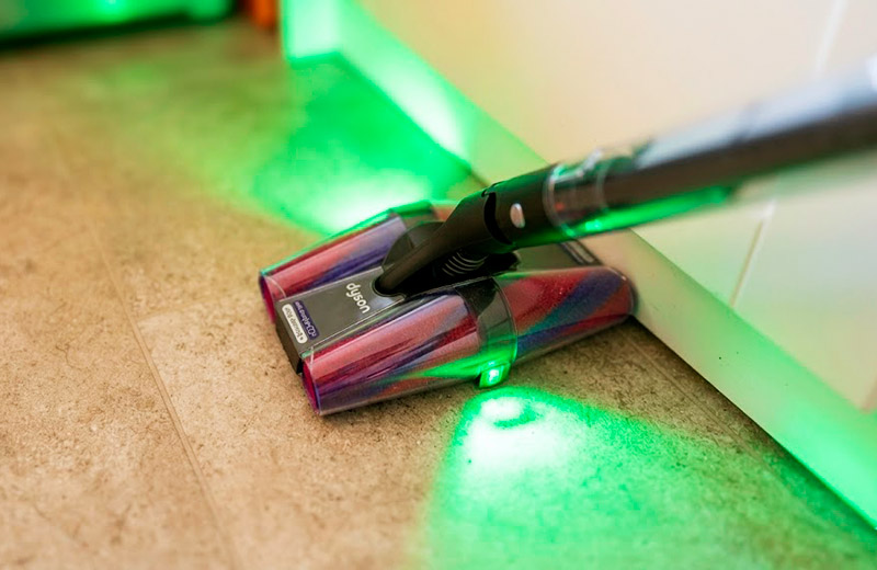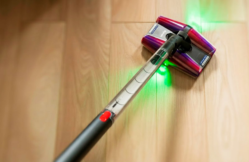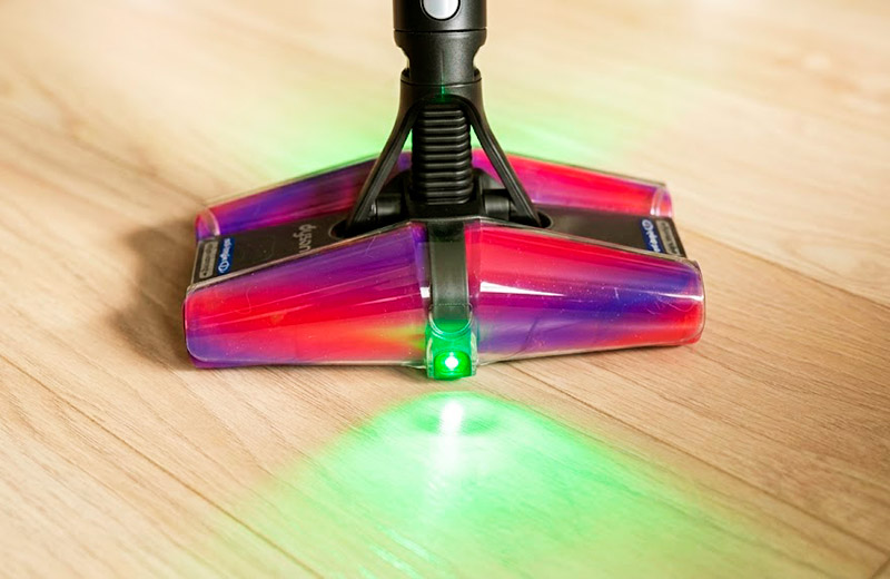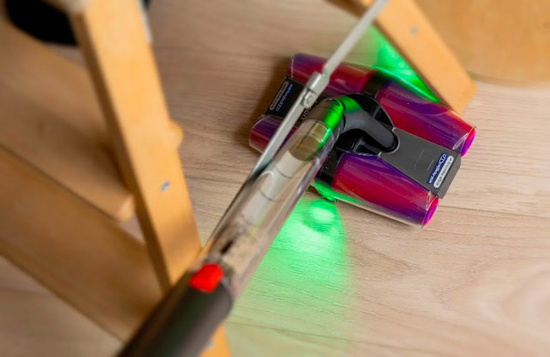 Сама щётка отличается компактностью и феноменальной манёвренностью. Чтобы пропылесосить под обеденным столом, мне даже не пришлось отодвигать стулья. А интегрированная двусторонняя LED-подсветка отлично выхватывает из темноты пыль и мелкий мусор.