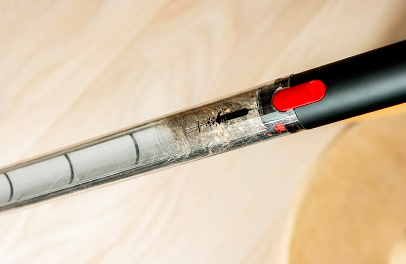 Несмотря на скромные 0,08 литра, пылесборник оказался на удивление вместительным. Секрет кроется в высокой плотности прессования мусора. Очистка контейнера продумана до мелочей и абсолютно гигиенична: отсоединили щётку, сдвинули механизм над мусорным ведром — и готово. При необходимости колбу можно легко снять и промыть под краном.