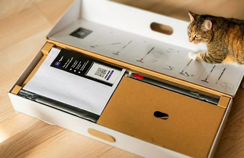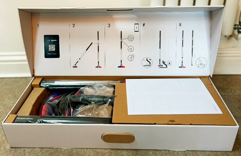 Сверхтонкий беспроводной пылесос Dyson PencilVac FluffyCones поставляется в объёмной, но продуманной упаковке.