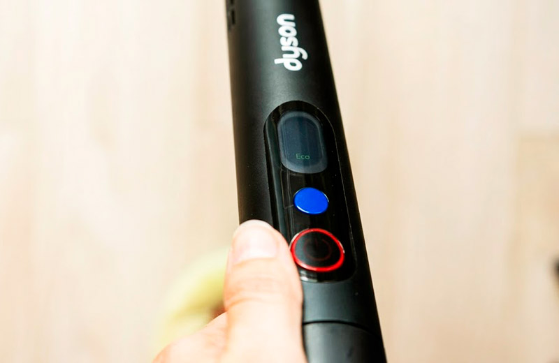 Инженеры Dyson применили любопытное решение: аккумулятор теперь работает ещё и как рукоятка. Пылесборник вытянут в строгий цилиндр. Блок управления спрятан прямо под батареей — он состоит из крошечного дисплея и пары кнопок для питания и смены режимов.