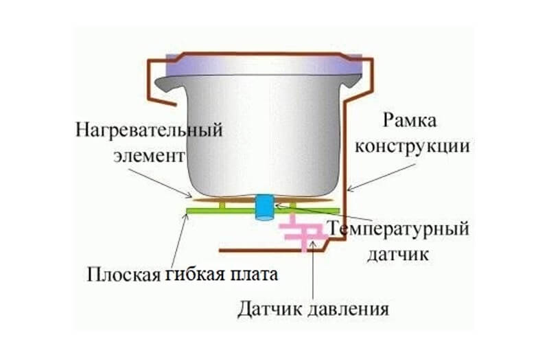 Термодатчик контролирует температуру внутри чаши и передаёт данные микропроцессору, а тот регулирует работу нагревательного элемента, управляет временем приготовления и переключает режимы.