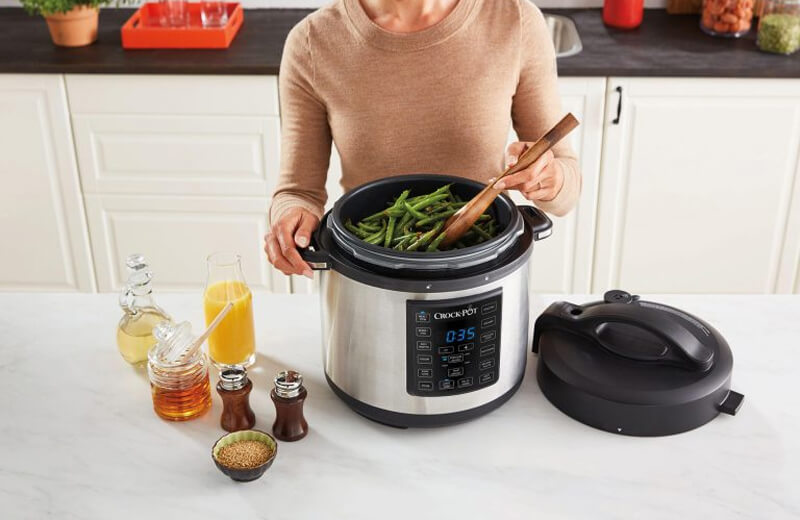 Она выполняет роль скороварки, пароварки и кастрюли для тушения, а с крышкой Extra Crisp становится аэрогрилем. В этом случае вы сможете жарить, запекать и готовить хрустящие блюда без использования большого количества жира. Встроенные весы позволяют точно отмерять ингредиенты без мерных стаканчиков, а объём в 6 литров означает, что вы сможете готовить для всей семьи.