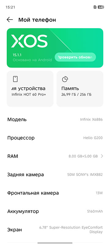 Если быть точным, тестовый образец приехал с версией XOS 15.1.1. Infinix на этот раз решила сыграть по-крупному и обещает для Hot 60 Pro+ три обновления операционной системы и 5-лет патчей безопасности.