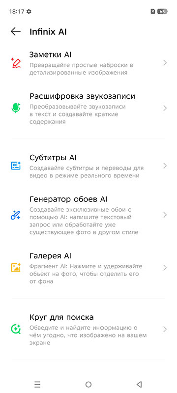 Вообще, Infinix не поскупилась на ИИ-фишки. Здесь и перевод в реальном времени, и помощь в правке документов. В заметках можно превратить набросок в картинку, есть даже генератор обоев и умный редактор фото.