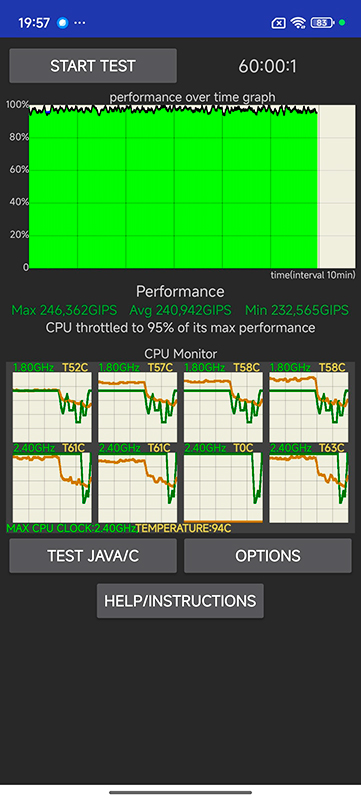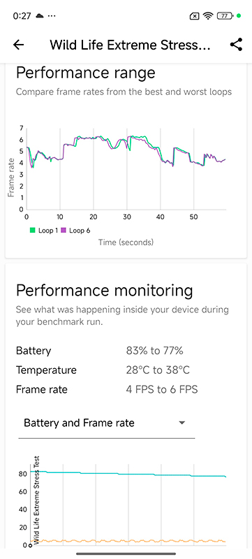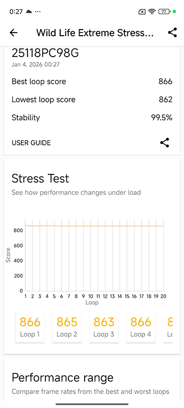 Snapdragon 6 Gen 3 не хватает звёзд в мощности, но у этого есть и обратная сторона — он почти не греется. Те крохи тепла, что выделяются, система охлаждения M8 отводит настолько эффективно, что троттлинг практически отсутствует. Смартфон сохраняет стабильность даже в затяжных стресс-тестах, не превращаясь в карманную грелку.