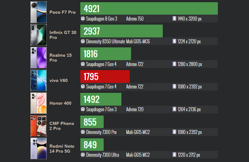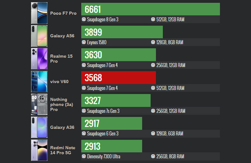 Vivo V60 работает на процессоре Snapdragon 7 Gen 4, который не намного мощнее SD 7 Gen 3, но разница в скорости работы заметна.