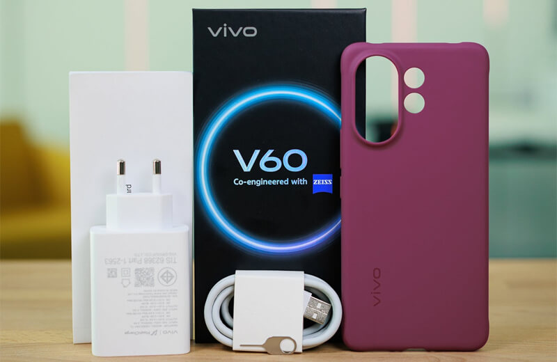 Хотя смартфон Vivo V60 приходит в непримечательной тёмно-серой картонной коробке, содержимое удивило.
