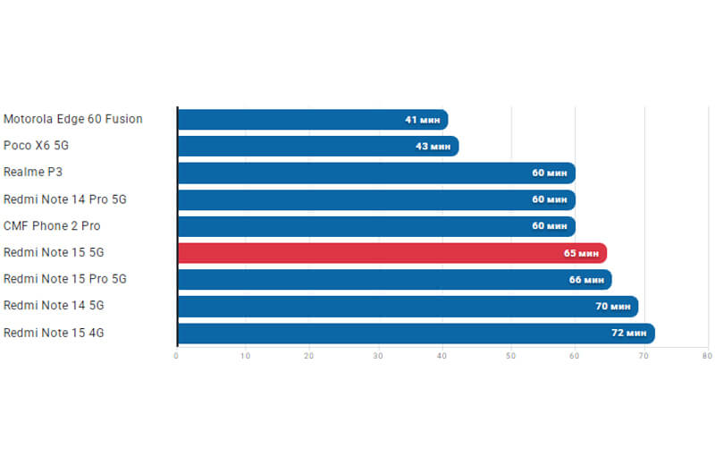 Процессор Snapdragon 6 Gen 3 не потянет современные 3D-игры, однако для данной ценовой категории производительность у него неплохая. Время работы тоже долгое, а полная зарядка занимает чуть больше часа. В бюджетном сегменте Redmi Note 15 5G оказался одним из самых выгодных смартфонов.